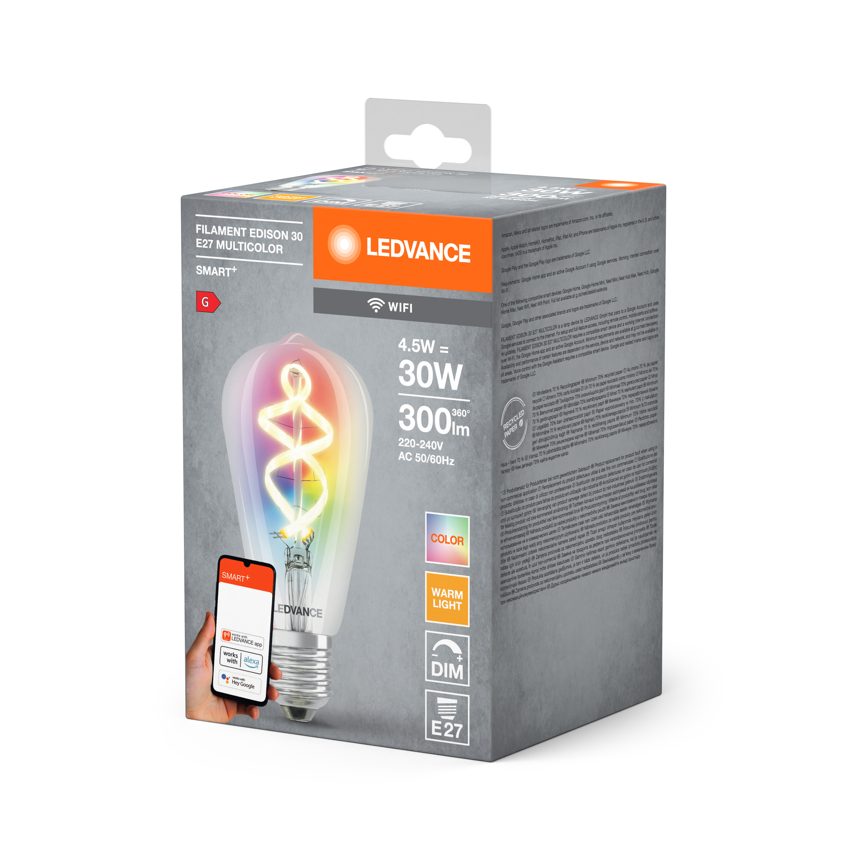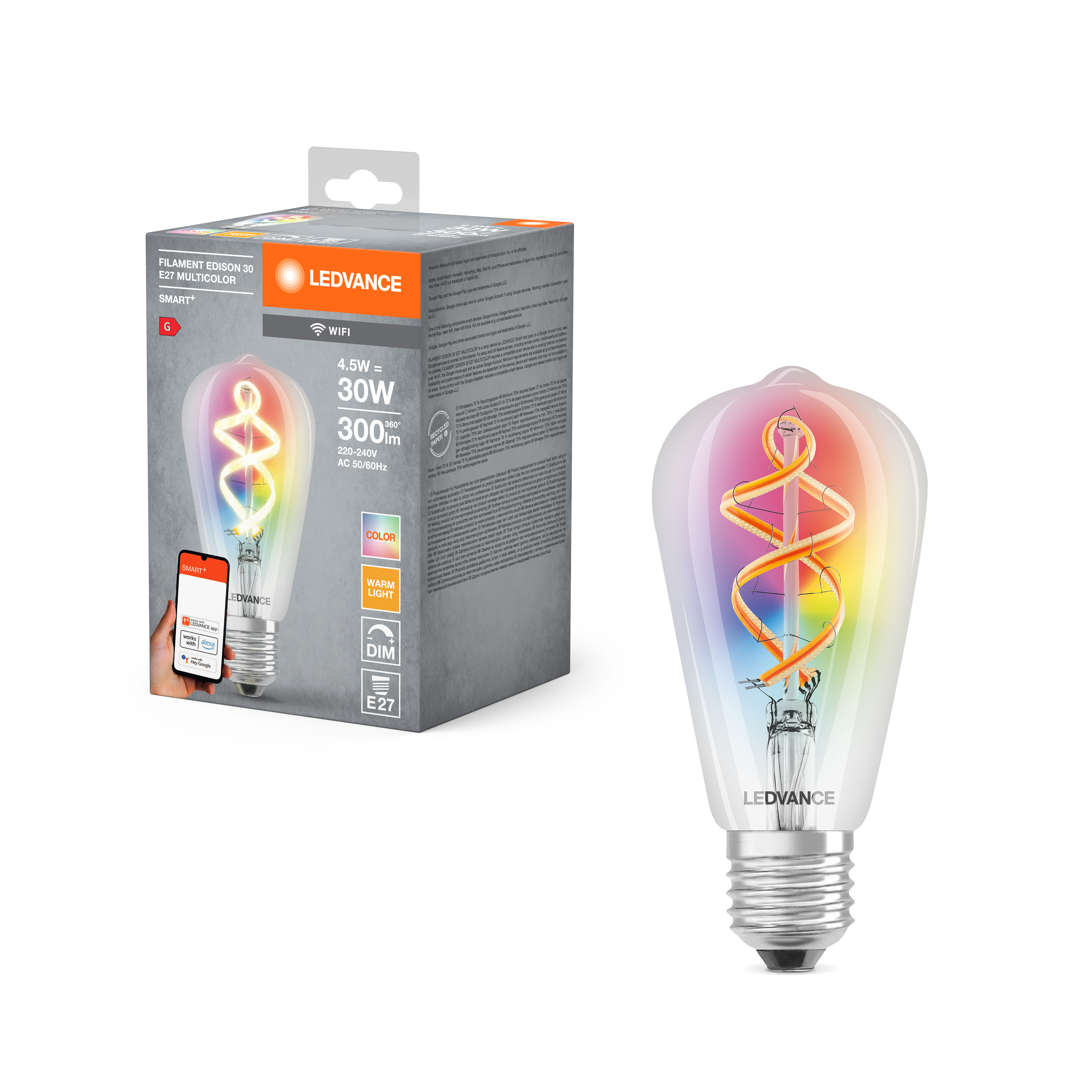 SMART+ WiFi Filament Edison Multicolour RGBW 30 4.5 W/2700 K E27